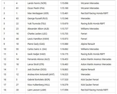 Max Verstappen, who initially set a strong pace during Q3, eventually settled into third, while veterans like George Russell (Mercedes) and emerging talents such as Yuki Tsunoda (Racing Bulls) completed the top five. The session also revealed that while many drivers posted competitive times, a few faced technical issues or off‑track moments—underscoring the fine balance between raw pace and consistency that will be crucial on race day.